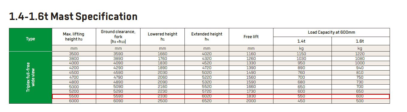 Итак, сопровождаемый штабелёр Hangcha CDD16-XT1-SI с мачтой 5500мм. Таблица с характеристиками мачт: