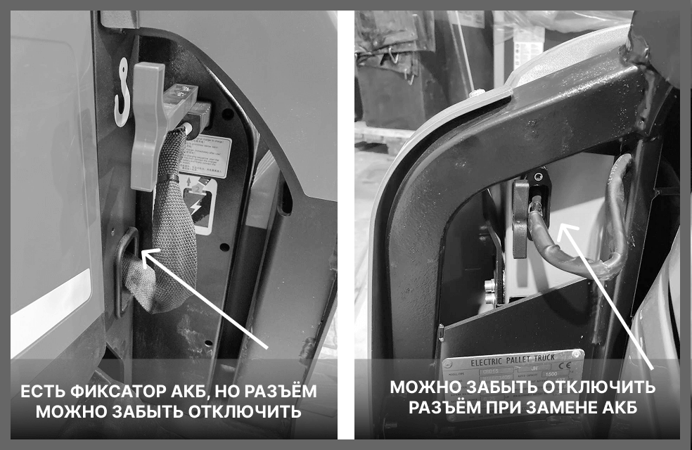 На аккумуляторах тележек в нашем примере силовой разъём расположен сбоку, и для замены аккумулятора необходимо сначала отсоединить питающий кабель. На обеих тележках разъём оснащён захватом, который упрощает эту процедуру. Однако при съёмке мы регулярно забывали отсоединить провод, прежде чем вытащить батарею. И если на левой тележке удар, которому подвергается разъём был не очень сильным из-за того, что сначала нужно ослабить фиксатор батареи, то на правой тележке разъём бился о верхнюю раму батарейного отсека при каждой попытке вытащить аккумулятор.