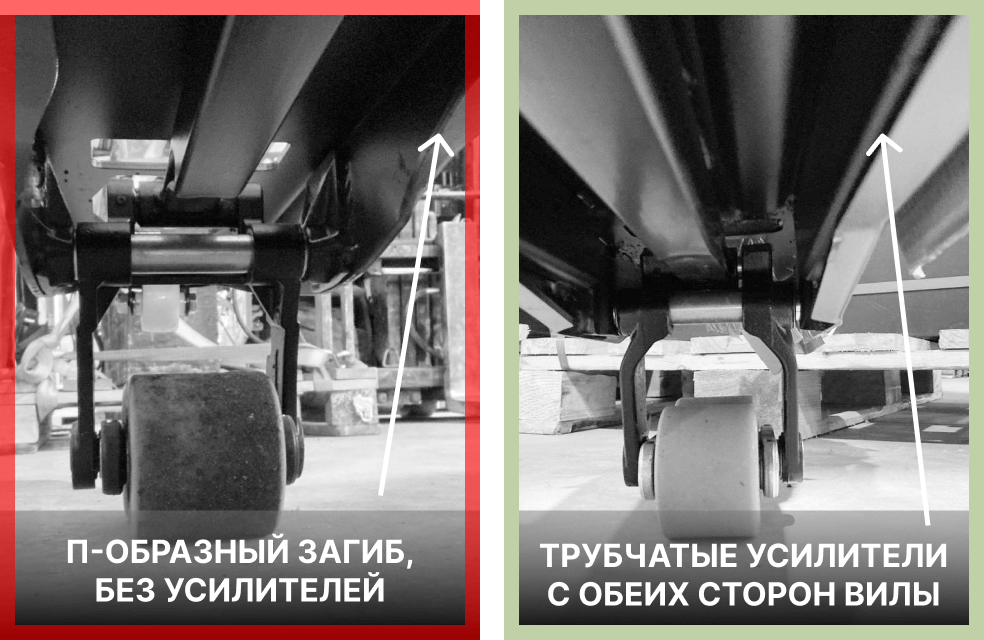 Вилочные захваты обеих тележек выполнены из штампованной стали. У левой модели усиление обеспечивает П-образный загиб края с двух сторон по всей длине. У правой модели кроме загиба края присутствуют полые усилители квадратного сечения с обеих сторон каждой вилы и дополнительные штампованные рёбра жесткости на несущей поверхности.