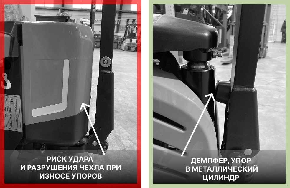 У правой модели в нижней части установлен резиновый демпфер, и при износе упоров удар приходится в металлический кожух гидравлического цилиндра. Такое решение может стать более долговечным.