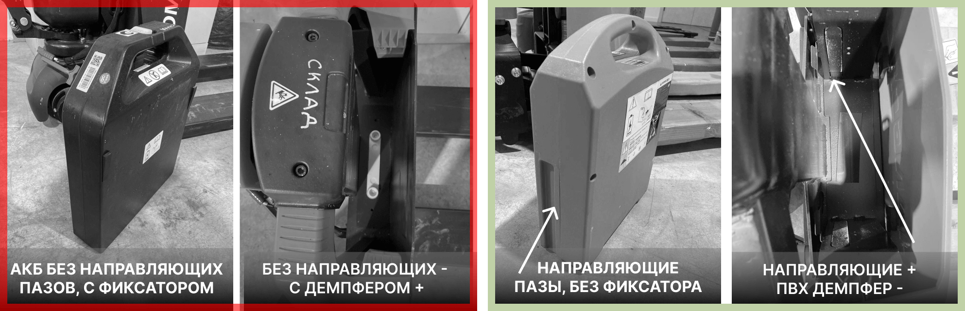 На правой тележке аккумулятор имеет специальные пазы, а аккумуляторный отсек оснащён направляющими, которые предотвращают некорректную установку. Демпфер — приклеенная полоска вспененного ПВХ, которая со временем потеряет эластичность.