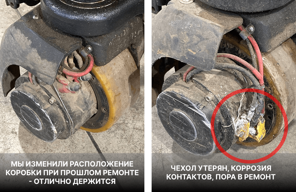Как можно заметить на следующей иллюстрации, расположение блока контактов на левой тележке изменено — она уже бывала в руках наших мастеров. Такое расположение хорошо себя зарекомендовало. Правую тележку ожидает та же процедура. Повреждение этого блока — следствие смещения защитного чехла при повороте ручки и ударов об поддоны в этом положении.