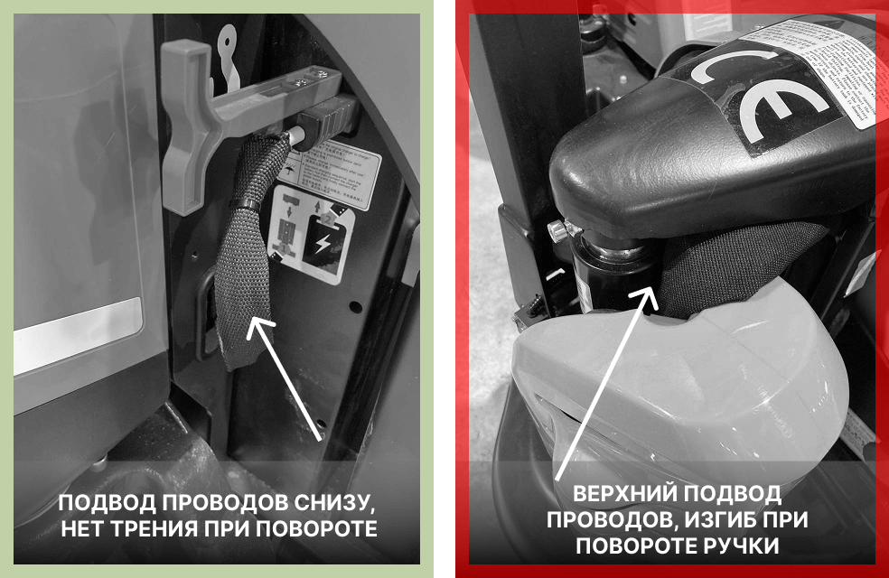 Зато на левой тележке лучше реализован подвод силовых проводов от аккумулятора: они подходят к двигателю снизу и испытывают меньшую нагрузку на излом. На правой тележке силовые провода перегибаются при каждом повороте ручки. Это может ослабить крепления и привести к преждевременному износу поводки.