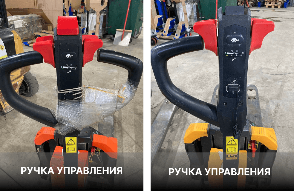 В нашем примере тележки имеют одинаковую грузоподъёмность (1500кг), одинаковую ёмкость аккумулятора (24В/20Ач), одинаковое количество колёс (сдвоенные подвилочные ролики, без дополнительных опорных колёс). Стоимость тележек около 120 000 руб. Присмотримся к деталям.