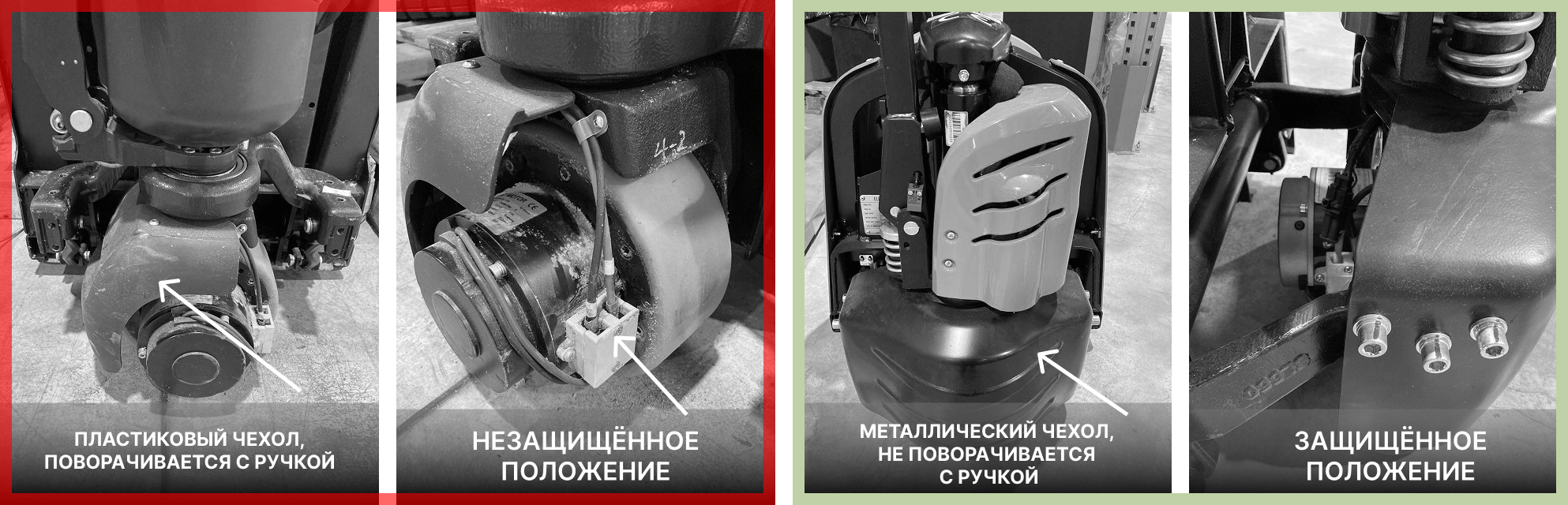 Продолжаем рассматривать тележки. На обеих моделях ведущее колесо защищено чехлом. На левой модели чехол пластиковый и вращается вместе с ручкой. При повороте ручки на 90 градусов блок электрических контактов, установленный на штифте, оказывается снаружи. При перемещении тележки в таком положении он часто подвергается ударам об поддоны и, скорее рано, чем поздно, выходит строя.